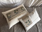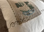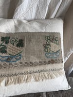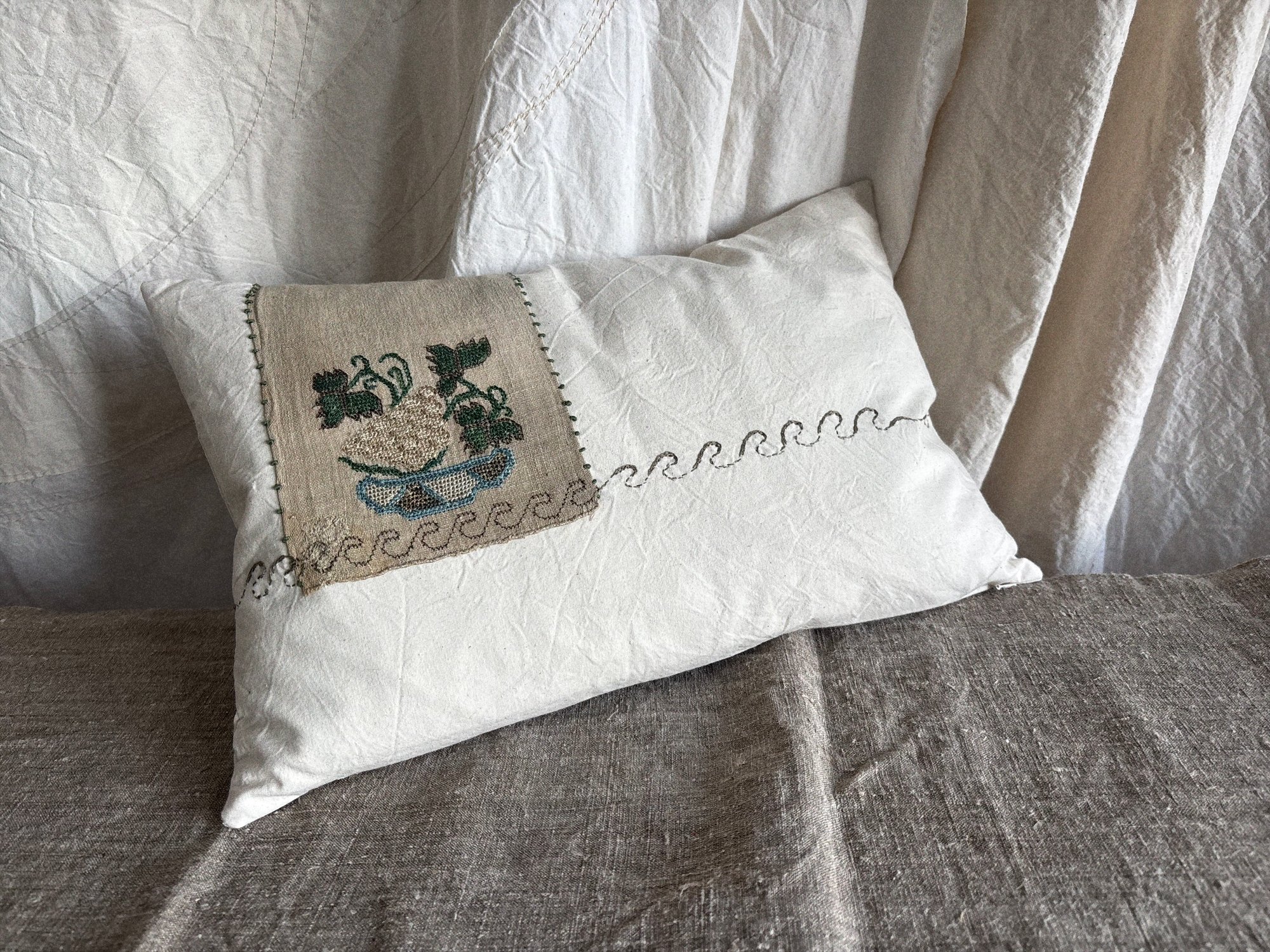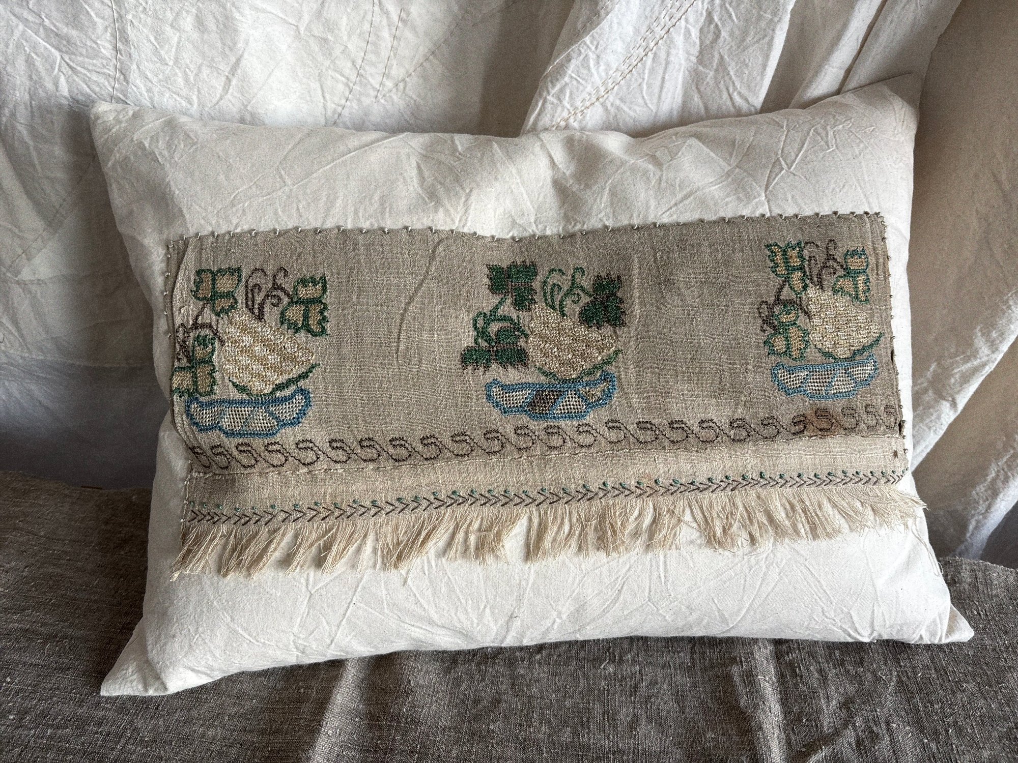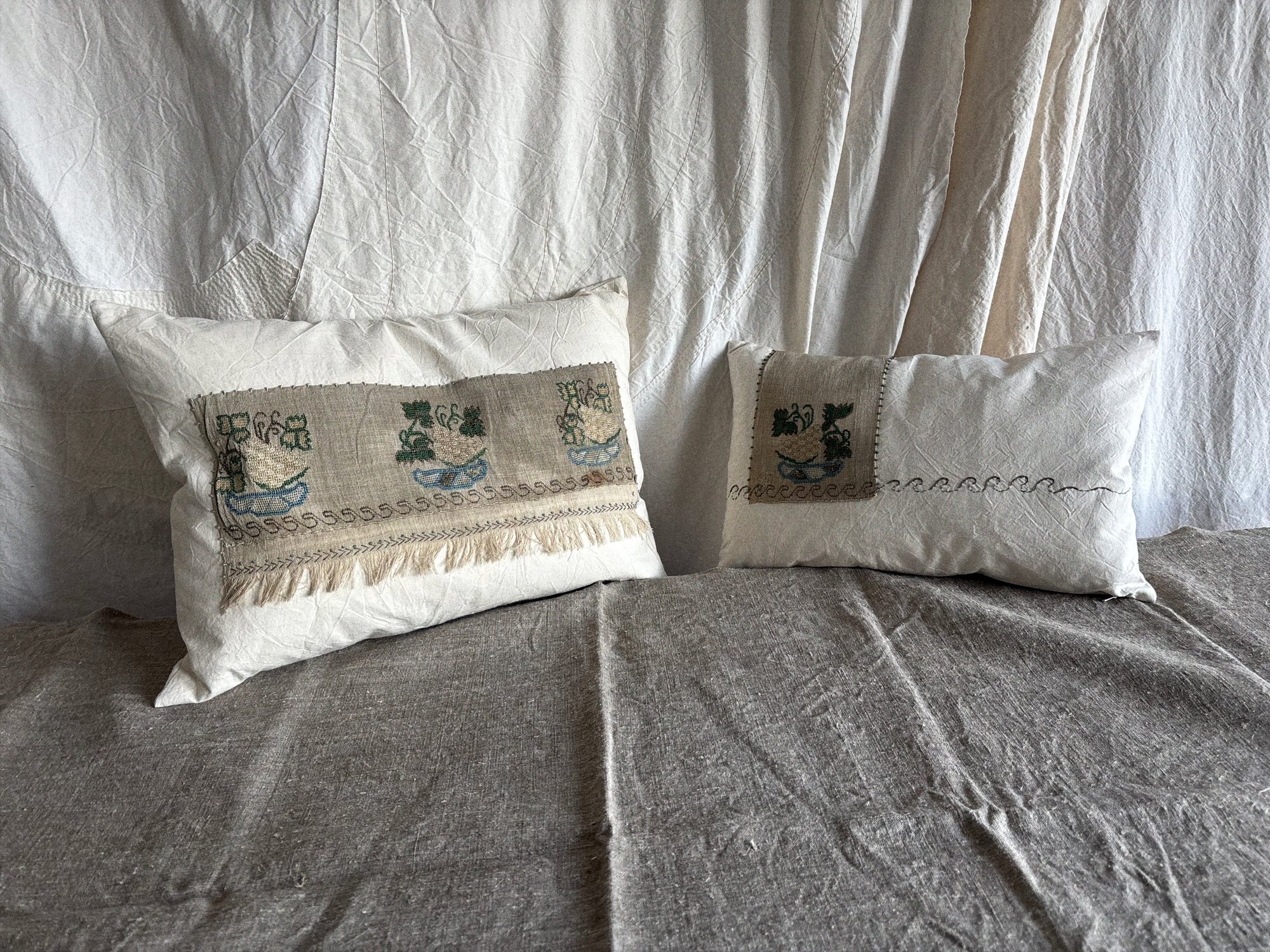2 x early 20th century Turkish charming grape designs beautifully hand embroidered on a hand woven cotton cloth. These have been restored and then embellished with further hand embroidery on a calico ground. Ideal for a bedroom or for seating that won't have small feet jumping up and down on it. These old embroideries should be cherished. Invisible zip closure at the base.