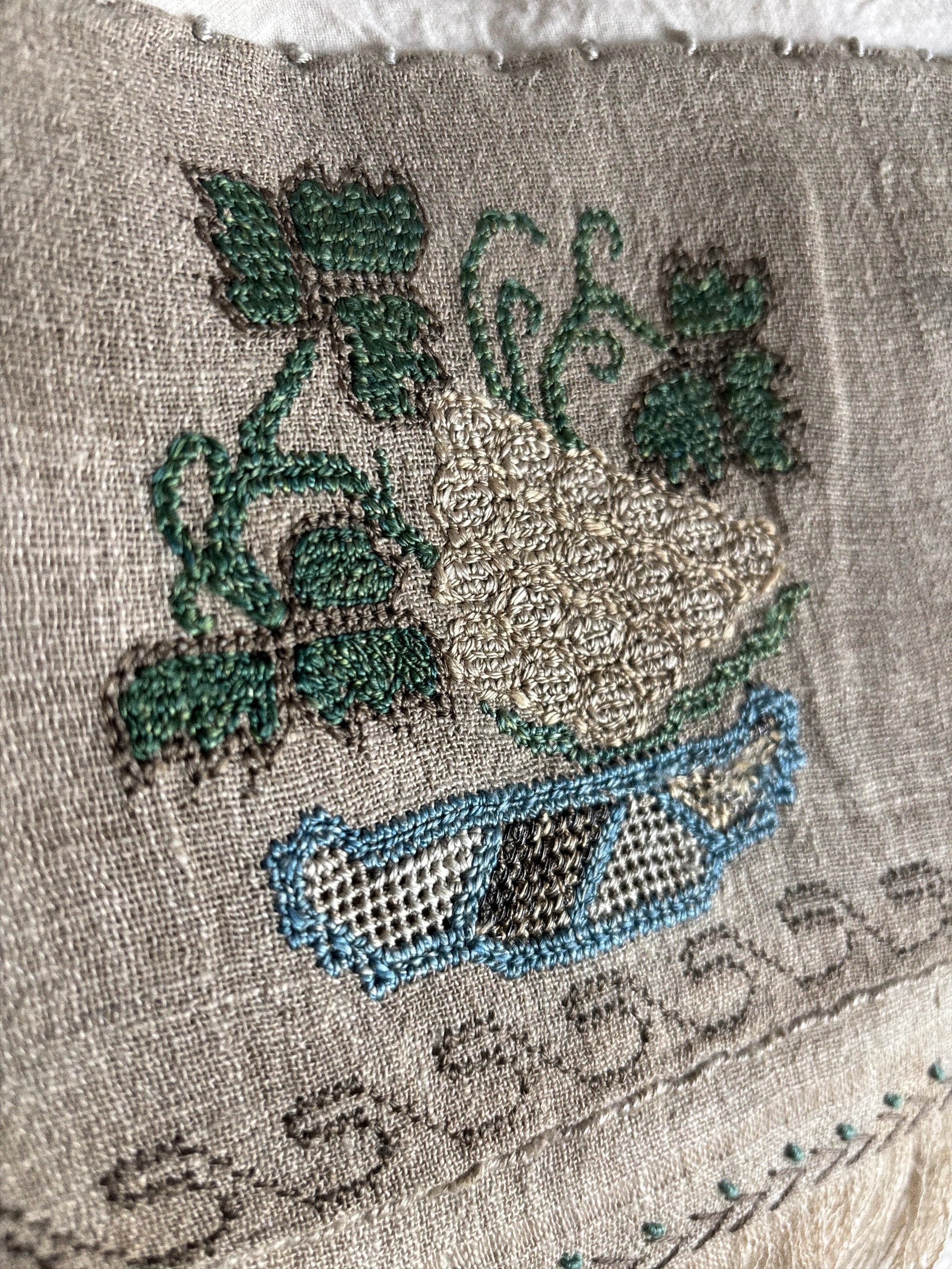 2 x GRAPES DESIGN EARLY 20TH CENTURY HAND EMBROIDERED ANTIQUE TURKISH TEXTILE ON CALICO