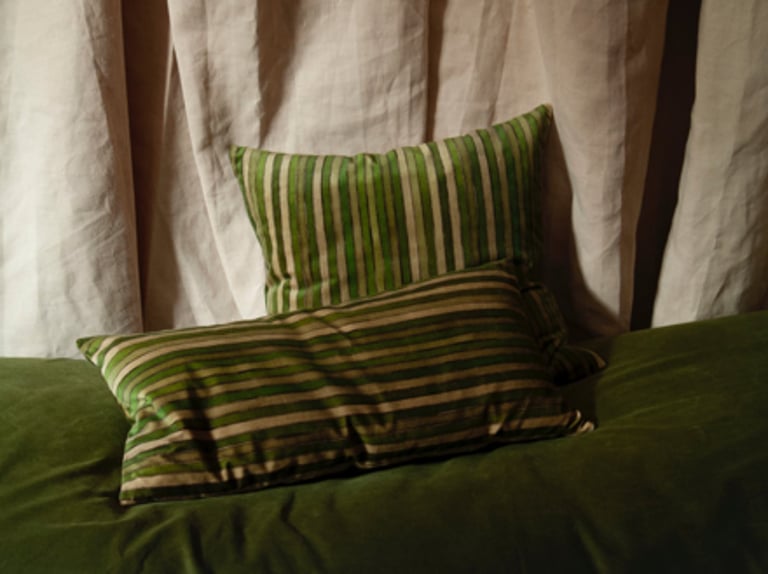 LEAF/LIME PRINTED STRIPE VELVET OR LINEN with natural linen back or double sided print