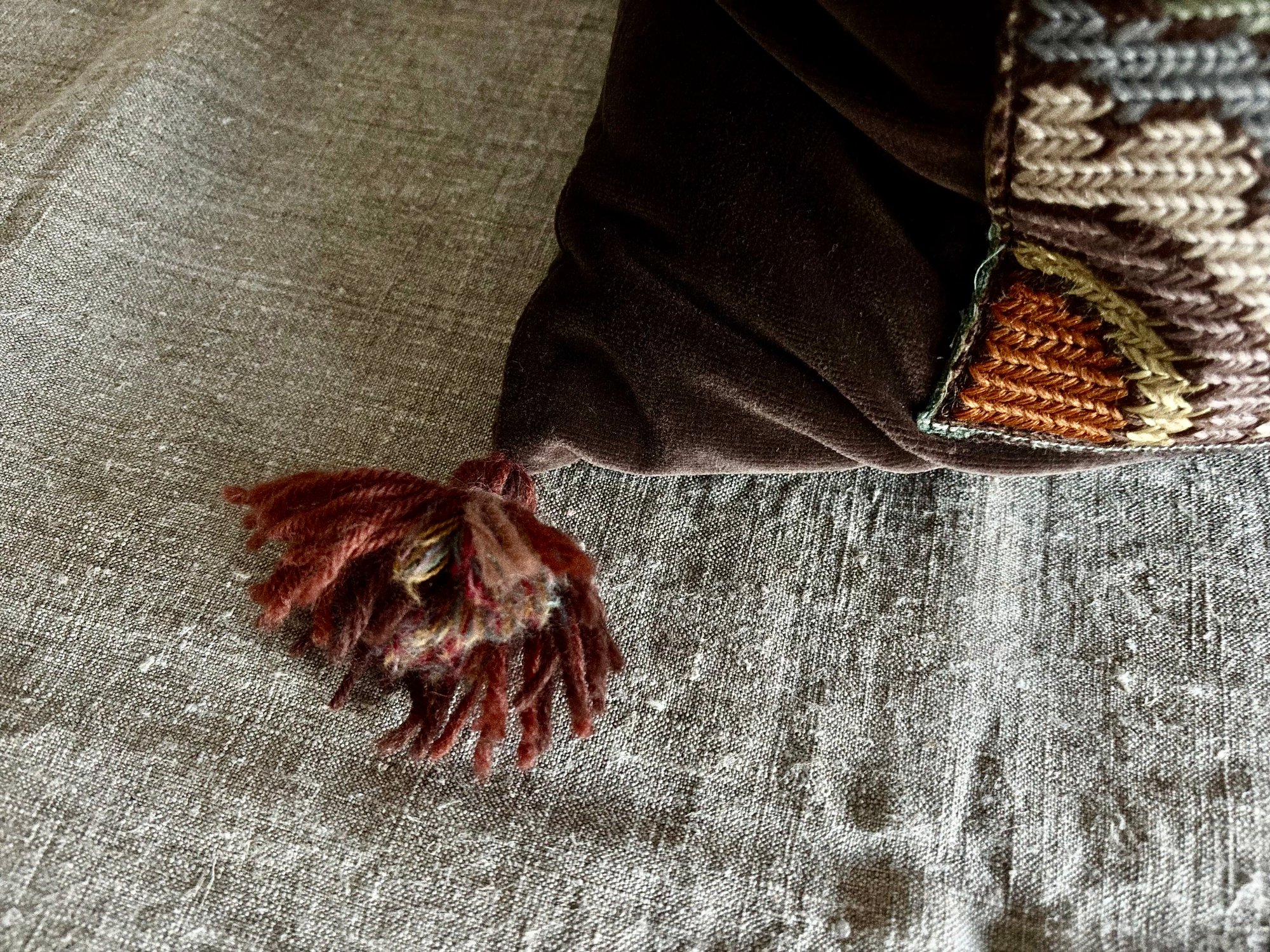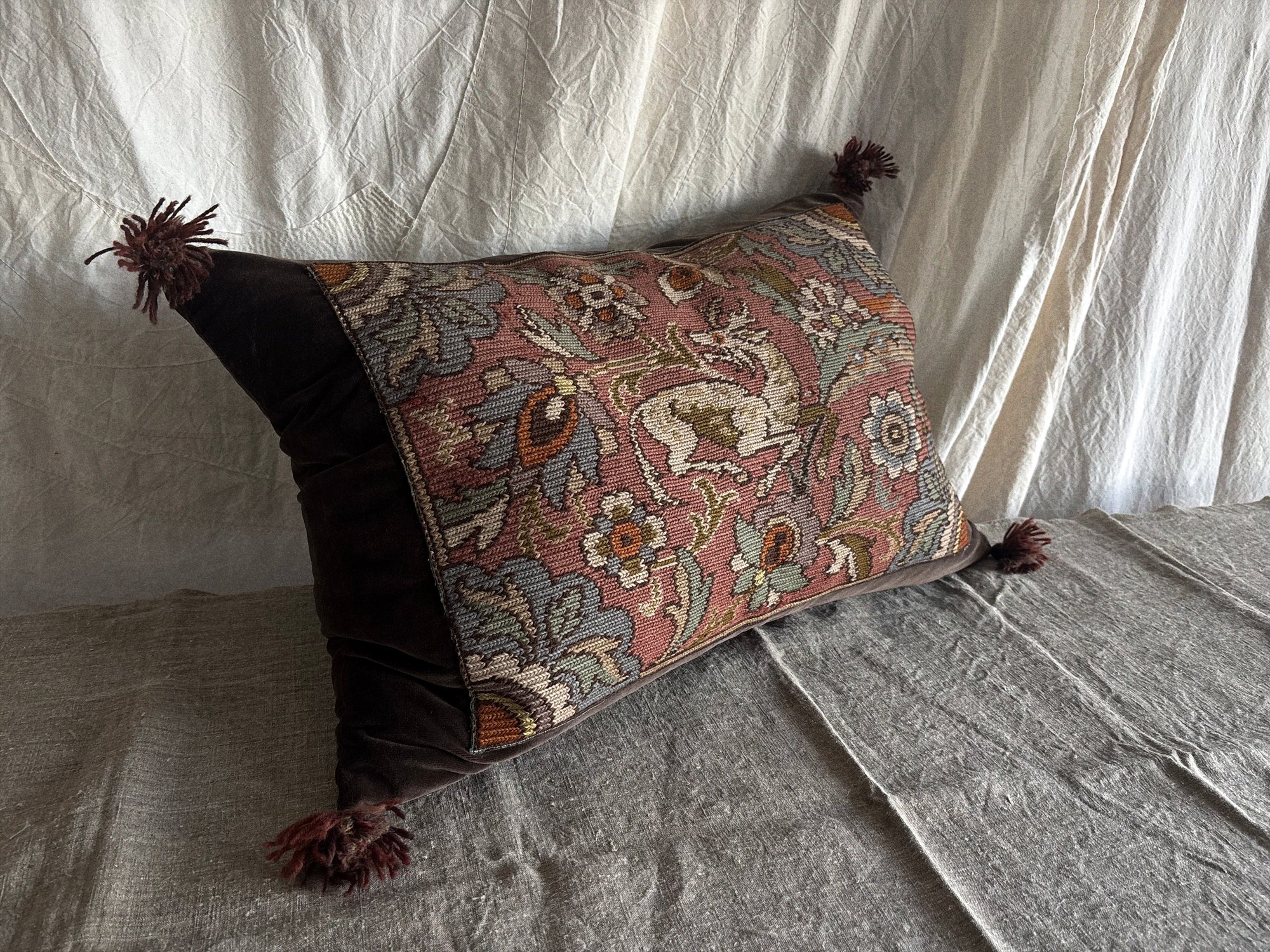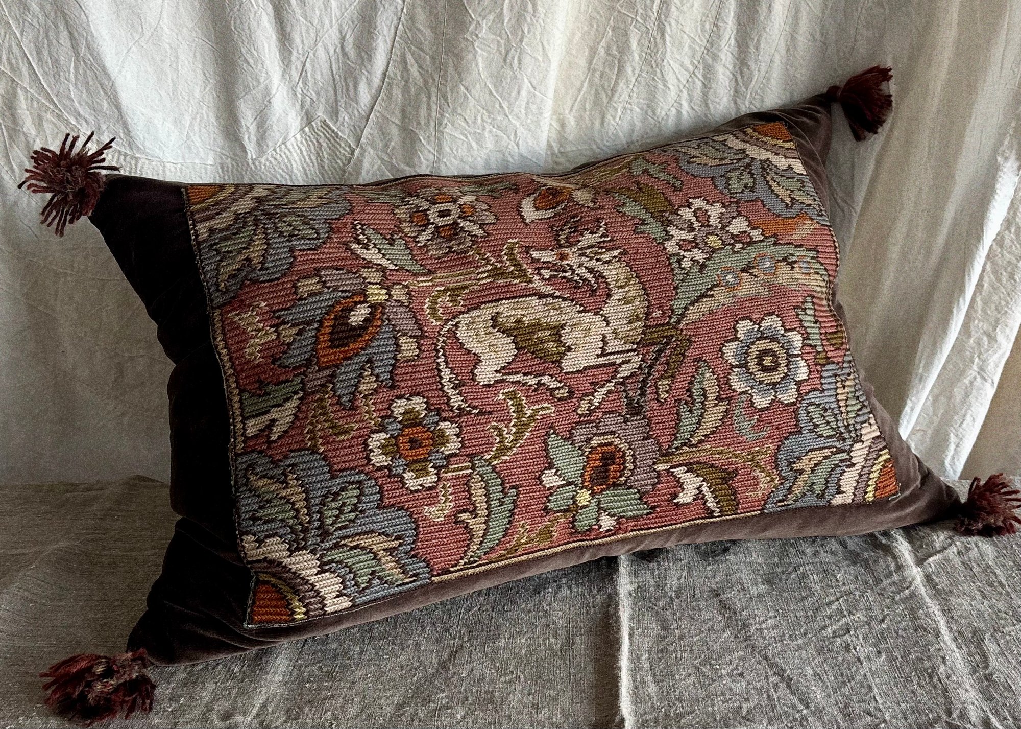 A glorious elk design within this vintage Swedish tapestry panel. Sewn onto hand recoloured vintage cotton velvet in a delicious chocolate tone, decorated with handmade wool tassels. All-in-all a very joyful cushion!